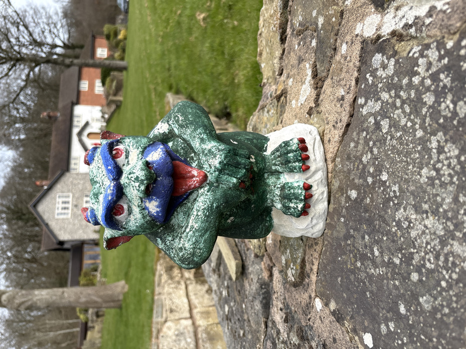 A green, gargoyle-like statue with mottled white accents, blue facial markings, red eyes, and a protruding red tongue is situated prominently in the foreground. The statue features small red horns/ears and red claws on its hands and feet, which rest on a small white base. It is posed in a squatting position with its hands clasped on its knees. The statue rests on a broad, flat, dark gray stone surface covered in patches of lighter gray and white lichen. Behind this surface, a lower wall constructed from rough-hewn brownish-grey stones is visible, followed by a gently sloping, well-maintained green lawn. In the mid-ground, two distinct residential structures are present. To the left, a two-story house with light grey stone or render walls and a dark roof stands partially obscured by a tall, bare tree trunk. To the right, a multi-part house features a central white section with a prominent front door accessed by steps, and an adjoining reddish-brown brick section. Both houses possess dark roofs and visible chimneys. The distant background consists of bare deciduous trees and wooded hills under an overcast sky. A dark vehicle is partially visible on the far right. The scene is located in Annscroft, United Kingdom.