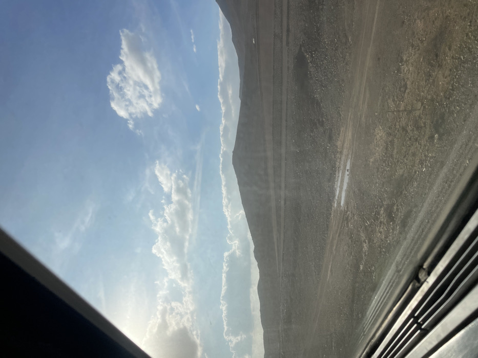 The photo depicts a landscape viewed from inside a vehicle, likely a car. On the left, there's a blue sky with scattered white clouds. In the middle, a hazy mountain range stretches across the frame. To the right, a rugged, arid terrain is visible, suggesting a desert or rocky environment. Vehicle interior components are visible, notably the edge of a sunroof or window. The image appears to be slightly tilted.