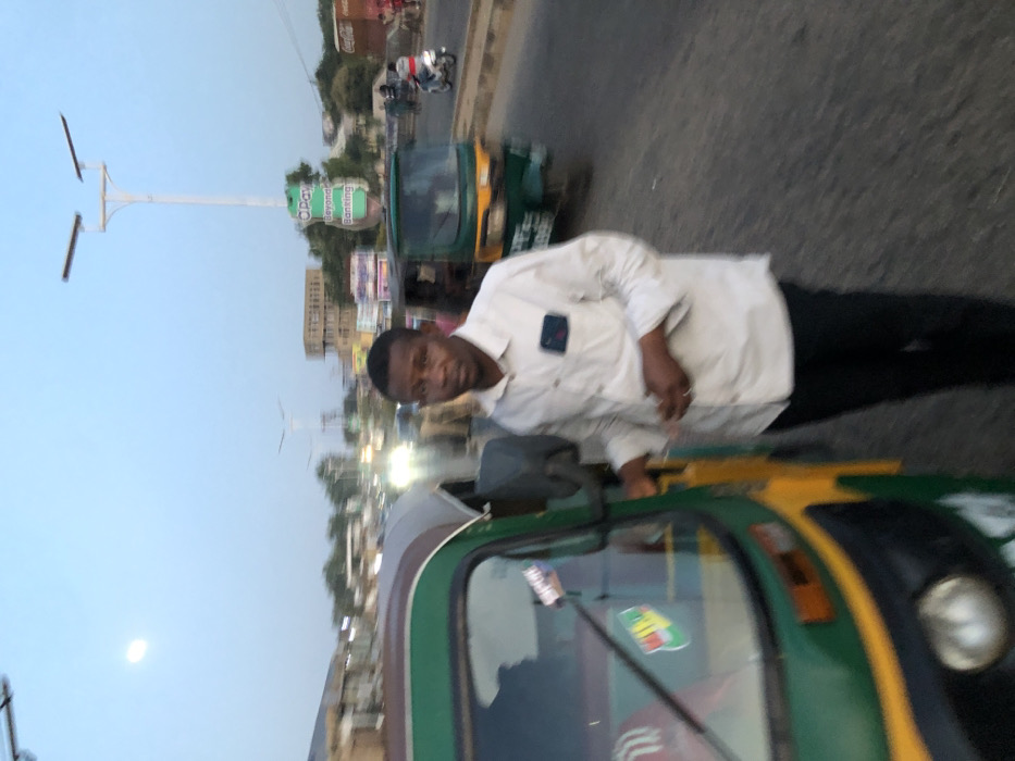 A still image depicts an urban street scene in Kabong, Nigeria, at twilight. In the left foreground, a dark-complexioned male subject, wearing a light-colored collared shirt with rolled sleeves and dark trousers, stands next to a stationary green and yellow auto-rickshaw. He faces the camera, holding a small, light-colored object in his right hand. A dark rectangular object is visible in his left shirt pocket, and a ring is present on his left ring finger. The auto-rickshaw's front headlight and windshield, bearing a small sticker, are partially visible. The asphalt road in the mid-ground shows vehicular traffic, including another green and yellow auto-rickshaw and a motorcycle with two occupants. Multiple streetlights, one prominently featuring a "O Pay Beyond Banking" banner, illuminate the scene. Buildings line both sides of the street in the background. A crescent moon is visible in the upper left quadrant of the light blue sky.