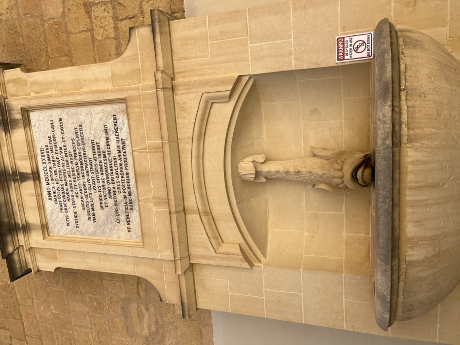 - "A historic stone fountain and a commemorative plaque are integrated into a light-colored limestone wall in Victoria, Malta" by FM-TV8UE3, licensed under CC BY 4.0