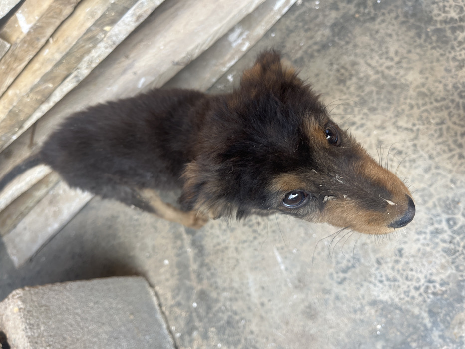 A small, brown and black puppy stares upwards. Its fur is ruffled and slightly dirty, with small specks of debris visible on its face. Large, expressive eyes dominate its face. The puppy stands on a mottled gray surface, possibly concrete. In the background are weathered, light-colored wooden planks. The image is taken from a high angle, emphasizing the puppy's upward gaze.