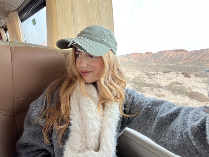 A fair-skinned individual, appearing female, is depicted looking out the window of a vehicle within the Zhangye Danxia National Geological Park in Zhangye, China. She wears a distressed olive green baseball cap, a grey textured jacket with small metallic studs, and a cream faux fur scarf. Her reddish-blonde hair is visible beneath the cap, and she displays a subtle smile with freckles on her left cheek, turned towards the window. The vehicle's interior features a tan upholstered seat and beige window curtains. Outside, an arid landscape with sparse vegetation transitions to prominent geological formations in the distance, characterized by horizontally layered reddish-brown and orange Danxia rock structures under an overcast sky.