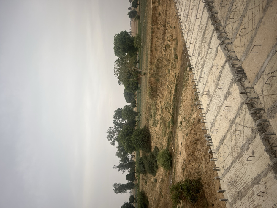 A landscape view dominated by a hazy sky. The terrain features a mix of vegetation and exposed earth. Trees and shrubs dot the mid-ground, hinting at a natural or rural setting. In the foreground, a concrete structure with visible rebar suggests construction or engineering work, contrasting with the natural backdrop. The image appears to be taken from an elevated perspective, potentially from atop the concrete structure itself.