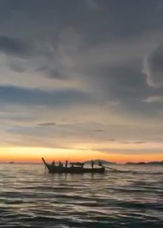 boat silhouetted against an orange and gray sunset over the ocean. Several people are visible on the boat, which is moving through the water. Distant land is visible on the horizon. The sky is cloudy, with shades of gray, blue, and orange. The ocean is dark with the reflection of the sky.