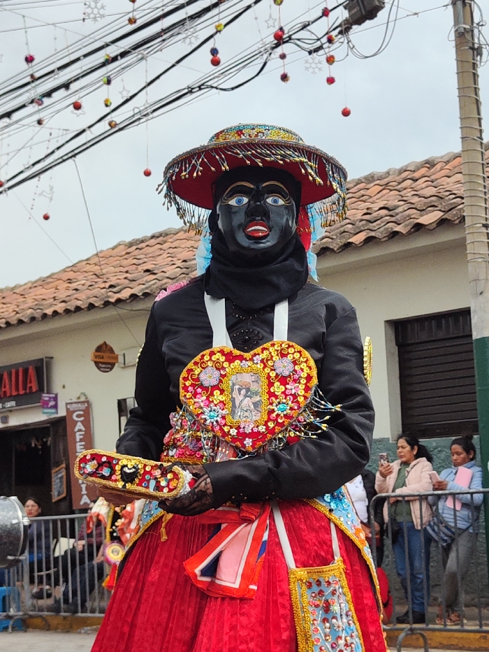 - "A performer in a parade wears a black mask with oversized blue eyes and red lips, topped with a colorful wide-brimmed hat" by FM-20kwN2, licensed under CC BY 4.0
