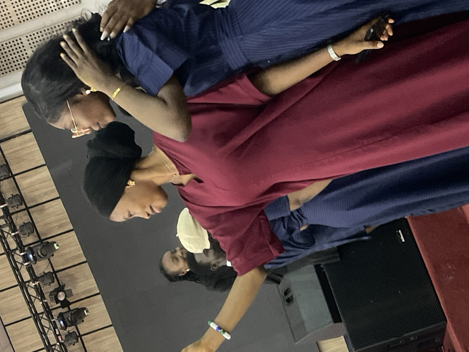 The scene is an indoor event space in Kufena, Nigeria, captured from a slightly upward angle. Two young women of dark complexion are positioned in the immediate foreground, with additional individuals partially visible behind them. The woman on the left wears a black headscarf, a maroon long-sleeved dress with a V-neck, small gold flower-shaped earrings, and a delicate gold chain necklace. Her right arm is raised, with a green, white, and blue beaded bracelet on her wrist. She exhibits a faint smile, looking towards the right side of the frame. The woman on the right wears a dark blue pinstriped short-sleeved dress and light-colored, square-framed glasses. A gold bracelet is present on her left wrist. Her left hand, featuring light-colored manicured nails, is raised and touches the back of her head. She smiles and looks towards the left, holding a dark, rectangular object, possibly a mobile phone, in her right hand. Behind these two women, a person in a dark top with gold hoop earrings is partially visible, smiling broadly. Another individual is seen wearing a light-colored cap. Further back, additional figures in blue patterned garments are discernible. Overhead, a metal truss system supports multiple professional stage lights. On the lower left of the frame, a black Adamson brand speaker cabinet rests on a red carpeted surface, which appears to be part of a stage or platform. The background consists of a dark, untextured wall with a vertical textured panel visible on the far right.