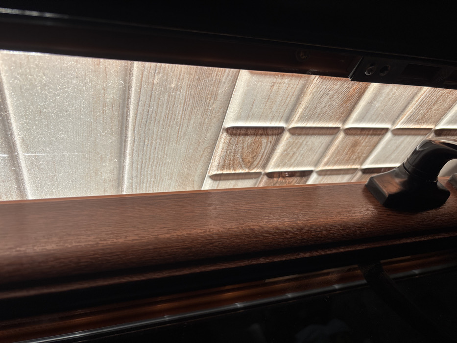 The scene depicts an interior perspective looking through a partially opened door in the city of Razhdak, Bulgaria. On the left, a dark brown, wood-grained doorframe is prominent, with a black, metallic door handle visible on the door itself, which is slightly ajar. Beyond the opening, a wall covered in textured ceramic tiles is brightly illuminated by direct natural light, highlighting suspended dust particles in the upper portion of the light beam. The upper tiles feature a light beige, horizontally striped wood-grain pattern. Below this, the tiles transition to a three-dimensional pattern of alternating light cream and brown rectangular blocks with rounded edges, creating a visually textured surface. The right edge of the door opening reveals the dark metal frame and strike plate of the doorjamb. No individuals or active interactions are present in the image.