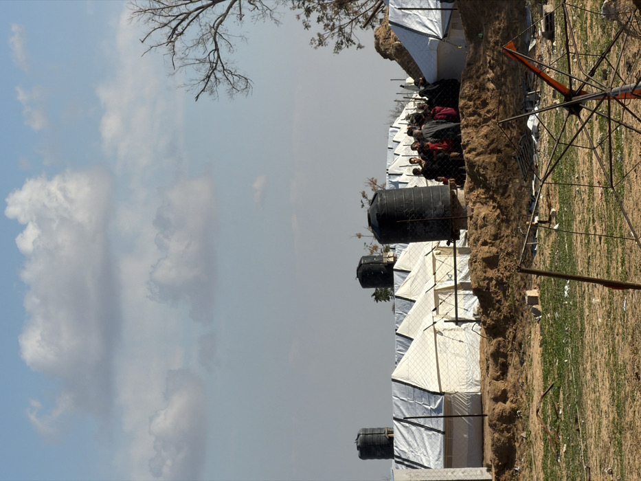 A horizontal view reveals a refugee camp with rows of white tents and black water tanks. A group of people stand close together near the tents, next to a dirt path that separates the camp from a field. An old metal structure with an orange center is partially visible. Above the camp, the sky shows a mix of blue and gray, dotted with scattered clouds and a tree's bare branches in the upper left corner.
