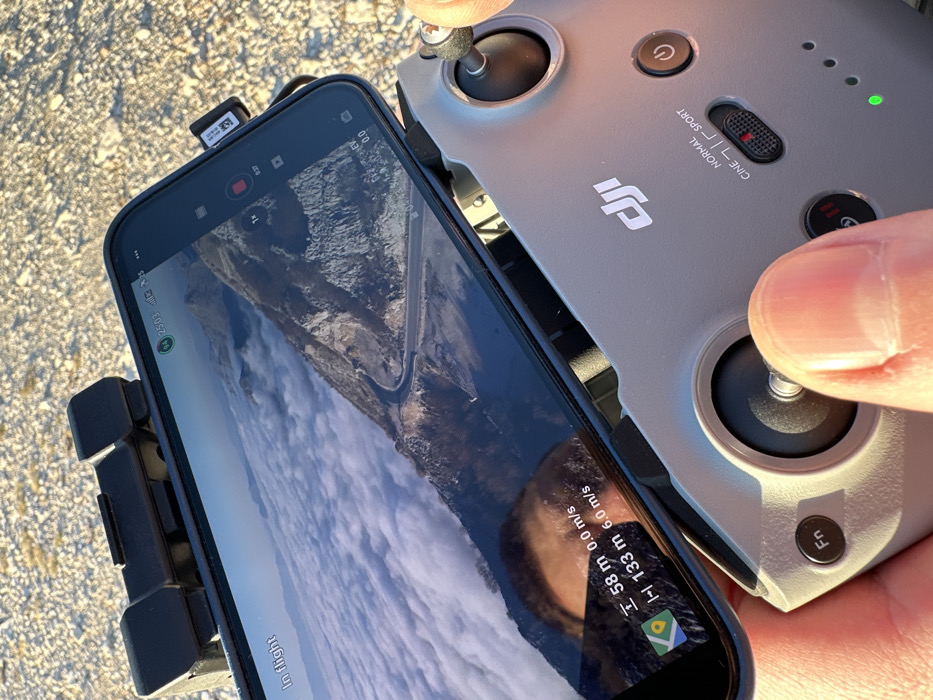 - "A close-up, high-angle shot shows an individual's hands operating a gray DJI drone remote controller with a smartphone attached atop it, positioned outdoors in Kuk, Montenegro" by FM-A8Ieo2, licensed under CC BY 4.0