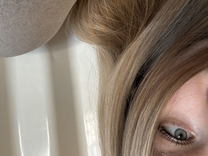 The image displays a close-up, cropped view of a person's upper left facial region. The specific location within Saint Petersburg, Russia, cannot be determined from the visual information presented. **People/Subjects:** A portion of a human face is visible, primarily featuring the left eye and surrounding skin. The eye has a light blue-green iris, a dark pupil, and a visible sclera. Dark, possibly mascarad, eyelashes are prominent. The skin around the eye and a segment of the nose on the far left exhibit a light, slightly pinkish complexion with discernible pore texture. Long, wavy, light brown to blonde hair partially covers the lower-left quadrant of the face. **Objects/Environment:** The background consists of two distinct areas. To the right, an off-white or very light beige vertical surface is present, exhibiting vertical linear indentations or paneling, suggesting a wall or partition with a ribbed texture. Subtle shadows indicate light casting from the left. In the lower right corner, a segment of a light grey or beige fabric object, possibly clothing or upholstery, is visible. The scene appears to be indoors. **Actions/Interactions:** No explicit actions or interactions are depicted. The subject's eye is open.