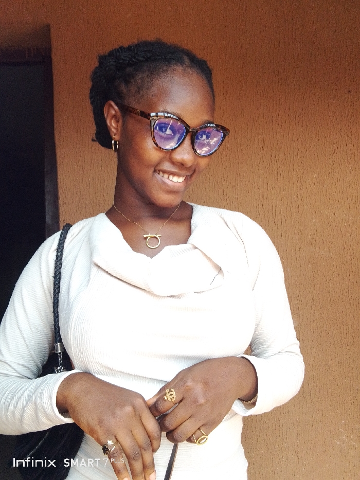 A young woman with dark skin smiles. She wears sunglasses, a gold necklace with a circular pendant, and a cream-colored long-sleeved top with a cowl neck. Her hair is styled in twists. She has multiple rings on her fingers. A black shoulder bag is slung over her left shoulder. The background is a combination of a dark doorway and a plain, textured brown wall. The phone model "Infinix SMART 7 PLUS" is visible in the bottom left corner.
