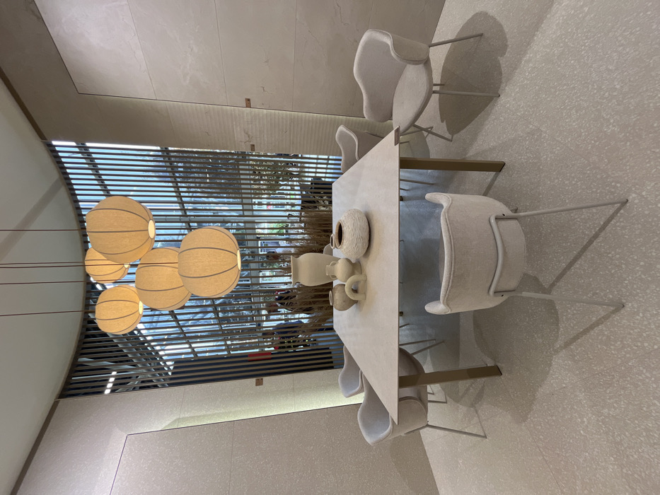 The image displays a contemporary interior design exhibit, likely an exhibition booth at BolognaFiere in Bologna, Italy. The central subject is a square dining table with a light-toned, subtly textured surface supported by four light-colored legs. Arranged around the table are six armchairs upholstered in light beige fabric with slim, light-colored metal legs; one chair is visible from the back in the foreground. Adorning the table are five decorative ceramic or pottery objects in various neutral tones (off-white, light beige) and organic shapes, including a tall vase, two smaller vessels, a textured pot, and an arched sculpture. Five spherical, fabric-covered pendant lights hang clustered above the table, providing illumination. The floor is a light-colored terrazzo-style material. In the background, a curved partition constructed of vertical slats reveals blurred figures of multiple individuals, indicating the presence of visitors or staff within a larger exhibition space. Large vertical panels of light-colored, textured material, consistent with ceramic tiles or stone slabs, are displayed as wall elements to the left and right of the central arrangement. Dried plant elements are partially visible behind the table, viewed through the slatted screen.