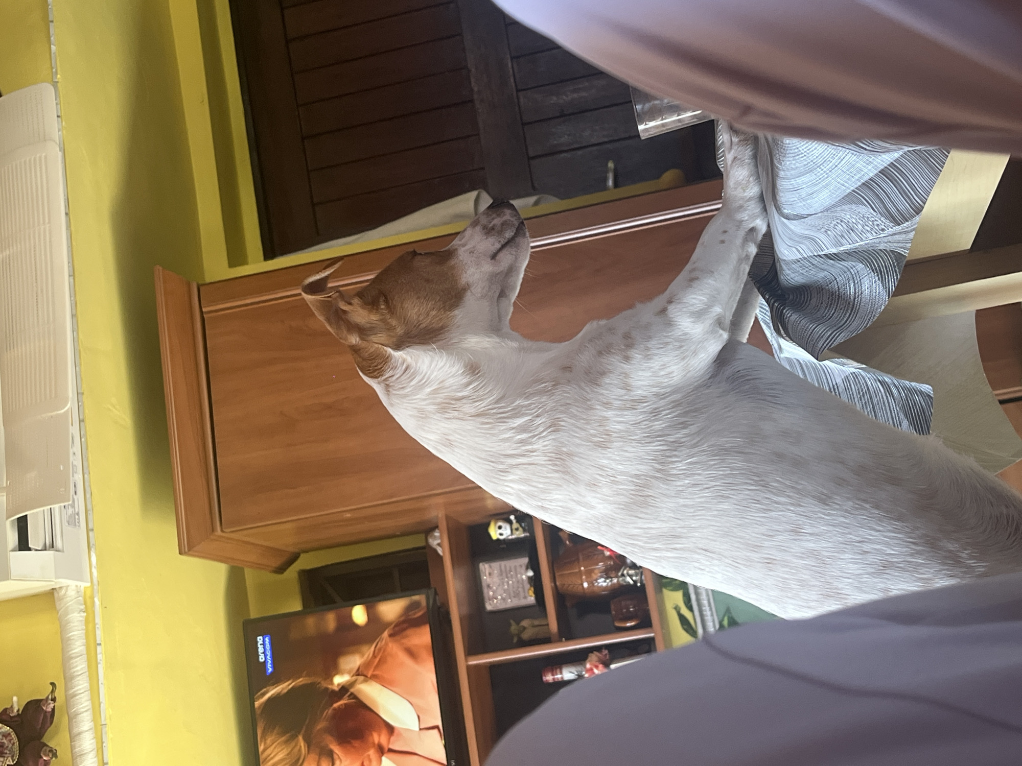 The image depicts an indoor domestic scene, specified as being in Varna, Bulgaria. A white and brown spotted dog stands on its hind legs with its front paws resting on a table covered by a striped, grey and white patterned tablecloth. A clear glass is present on the table to the right of the dog's paws. The dog's head is in profile, facing right. In the background, a flat-screen television displays "arena VIVACOM" and the partial image of a woman in an orange top. Below the television, a wooden shelving unit contains various decorative objects, including figurines resembling Yoda and a yellow skull holding a guitar. To the right of the shelving unit, a tall wooden cabinet and a dark wooden door are visible. A white split-system air conditioning unit is mounted high on the vibrant yellow wall. Portions of light-colored clothing, indicative of a person, are visible in the immediate foregrounds on both the left and right.