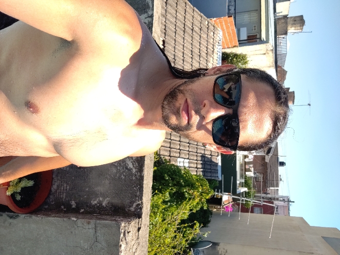A shirtless man with long dark hair pulled back into a ponytail stands outside on a sunny day. He wears sunglasses. A potted plant sits on a concrete ledge beside him. Behind him is a neighborhood scene with houses, roofs, greenery, and antennas. The photo is oriented sideways.