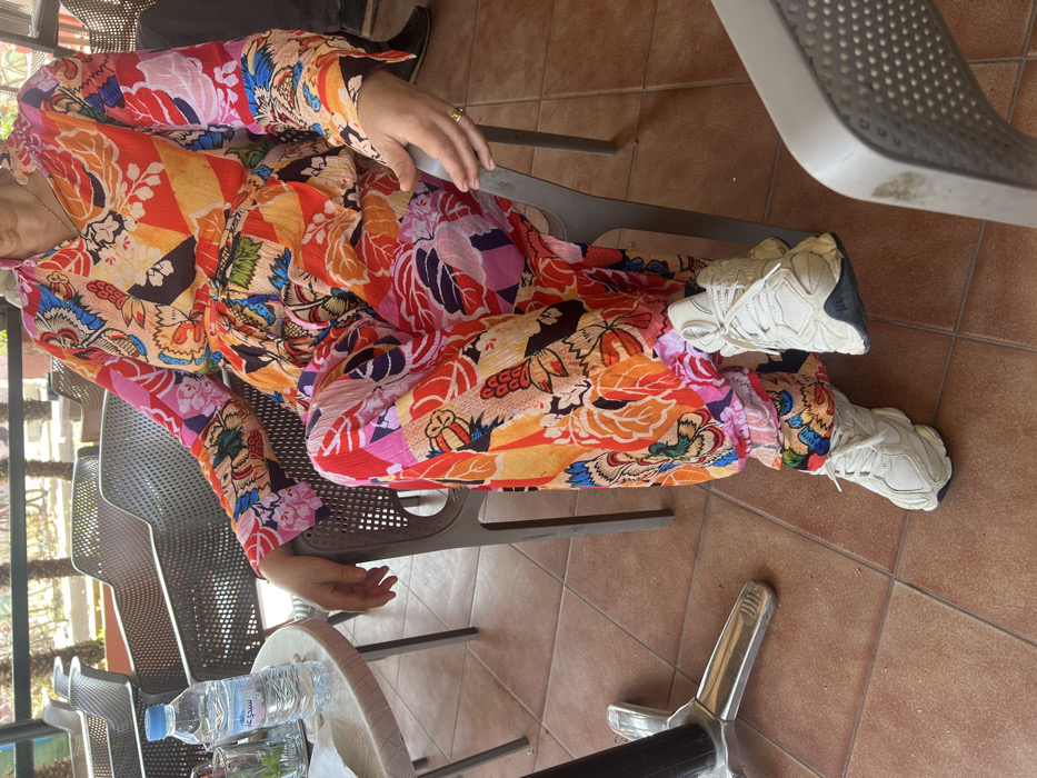 An individual is seated at an outdoor cafe in Mechra Bel Ksiri, Morocco. The person, viewed from the upper torso to the feet, wears a vibrant, multi-colored two-piece garment featuring a floral and abstract pattern in shades of orange, red, pink, blue, green, and black. The long-sleeved top has ruffled cuffs and a V-neck, and the trousers are loose-fitting. White athletic sneakers with chunky soles are worn; the right foot is slightly elevated and resting near the left. A thin gold-colored ring is present on the left ring finger. The individual is seated in a light grey, perforated plastic chair. To the left, a round light-colored table with a silver metal pedestal base holds a plastic bottle of 'Sidi Ali' mineral water, a clear glass containing a greenish liquid, and a white napkin. The flooring consists of reddish-brown square tiles. In the blurred background, additional similar cafe chairs and green foliage indicate an outdoor patio or terrace setting under daylight conditions.