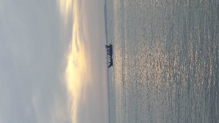 A solitary ship traverses a calm body of water, its silhouette stark against the shimmering surface reflecting sunlight. The horizon is faintly visible. Clouds dominate the left side of the frame, partially obscuring the light. The sky is a muted gradient, blending pale blues and yellows. A small dark shape, possibly a bird, is visible above the vessel.