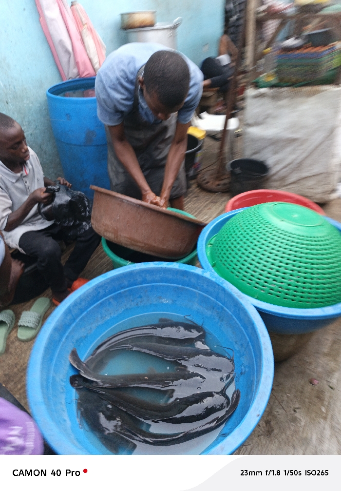 Two individuals are present in an outdoor setting. One is seated and holding a dark object, while the other stands, leaning into a brown basin. Several large, colorful plastic tubs are visible, one holding several dark catfish submerged in water. A green colander sits atop another tub. Behind them are blue barrels and various indistinct items. The scene appears to be a fish market or processing area.