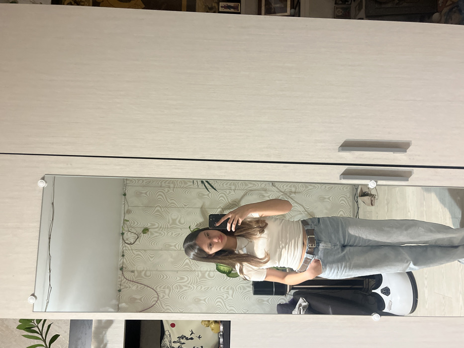 An indoor scene in Семибратово, Russia, depicts a young female taking a full-body mirror selfie. The female, with long brown hair, wears a white short-sleeved t-shirt, light blue loose-fitting jeans, and a dark brown belt with silver-colored studs. She holds a dark-colored smartphone in her right hand, positioned to capture her reflection, while her left hand is partially inserted into her belt loop. Her facial expression is neutral. The mirror is rectangular, attached to the left door of a light-colored wardrobe, secured by two visible white circular fixtures at the top. The adjacent right door of the wardrobe features two vertical silver-colored handles. The background reflected in the mirror shows a wall covered with light-colored, wavy patterned wallpaper. Visible reflected objects include several green plants, a dark, columnar electronic device resembling a speaker or air purifier, and a white, rounded floor fan or humidifier. A yellow statuette and a dark cushion with white patterns are partially visible on a shelf to the far left of the reflection. The environment is well-lit, suggesting artificial lighting.
