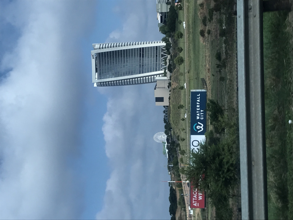 A tall, modern skyscraper stands against a cloudy sky. Below, a green landscape includes a Ferris wheel and "Waterfall City" signage. Additional signs with "Attacq Welcome" are visible. The scene is captured from a moving vehicle, as evidenced by a blurred roadside barrier.