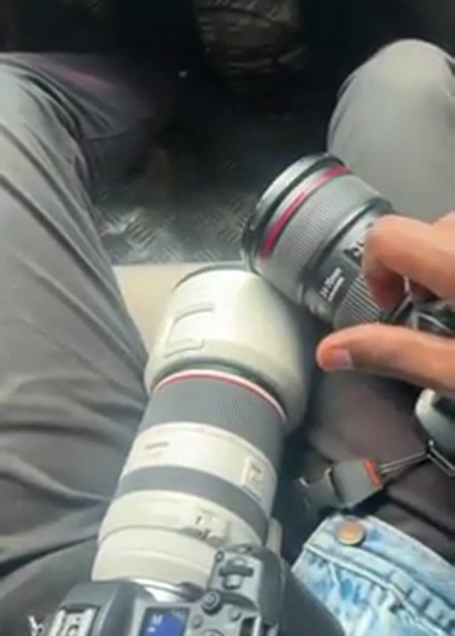 From a first-person perspective, the video shows a person in the front seat of a vehicle with a camera and two lenses resting on their lap. The person is wearing dark pants on their left leg and distressed denim on their right leg. The camera, a black Canon EOS R series, is positioned on their left leg, with a large white Canon zoom lens attached to it. The second lens, a Canon 24-70mm, is held in their right hand. The floor of the vehicle is visible, featuring a textured metal pattern. The lighting is ambient and appears to be natural daylight.