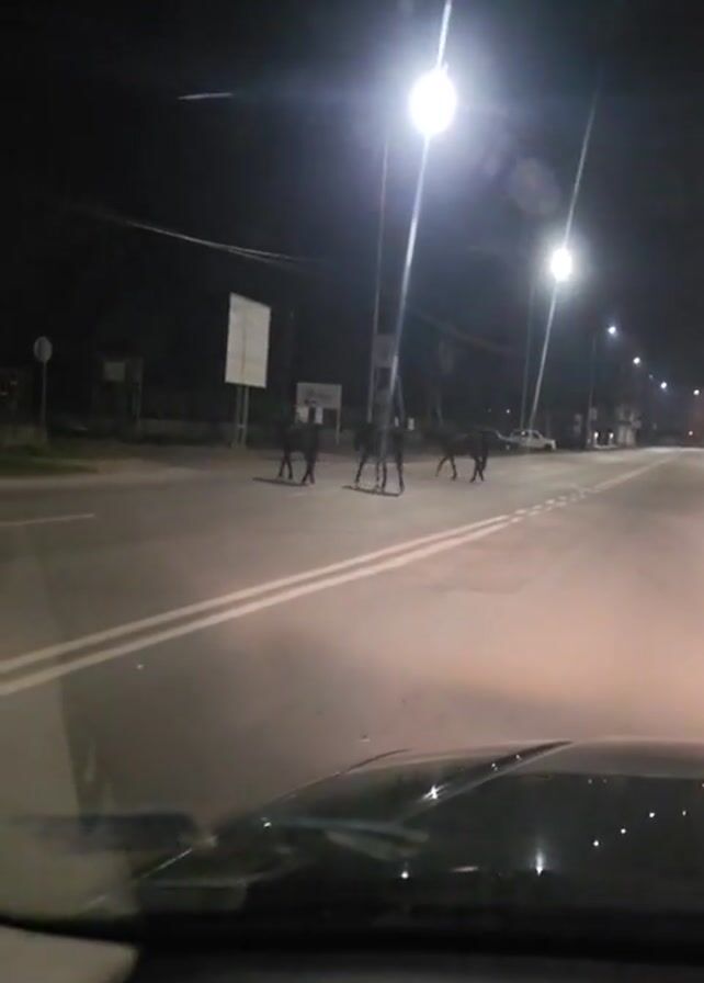 A car is driving on a dark, paved street at night. There are three horses standing on the street in front of the car. There are streetlights illuminating the area. There are two large signs next to the road. There is a car parked further down the street.