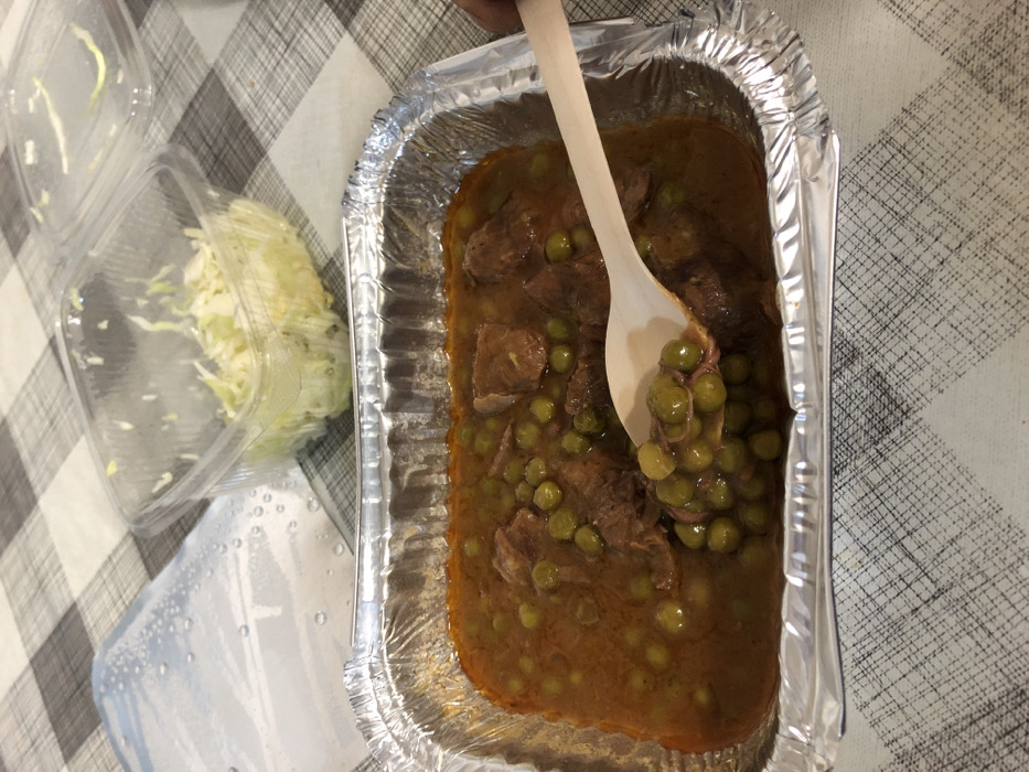 The scene is an indoor setting on a black and white checkered tabletop in Zaljevo, Montenegro. A rectangular aluminum foil container holds a stew containing dark meat pieces and green peas in a reddish-brown sauce. An unidentified human hand, visible on the right, holds a light-colored wooden spoon, which is partially submerged in the stew and laden with peas, suggesting active consumption. Behind the main container, a clear plastic square container holds shredded cabbage. To its left, a clear plastic lid, showing condensation on its interior surface, rests on the tablecloth.