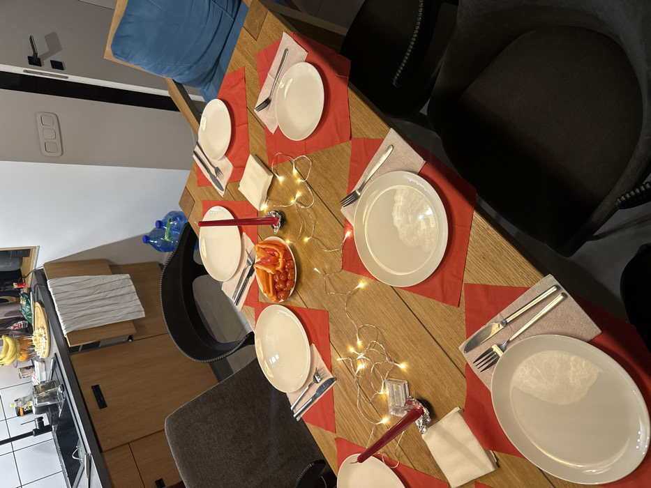 A wooden table is set for six people with red placemats, white plates, cutlery, and napkins. A small dish filled with red peppers and tomatoes sits in the center, alongside two lit red candles with fairy lights surrounding them. Black and grey chairs surround the table. In the background, a cabinet and items in a kitchen area are visible.