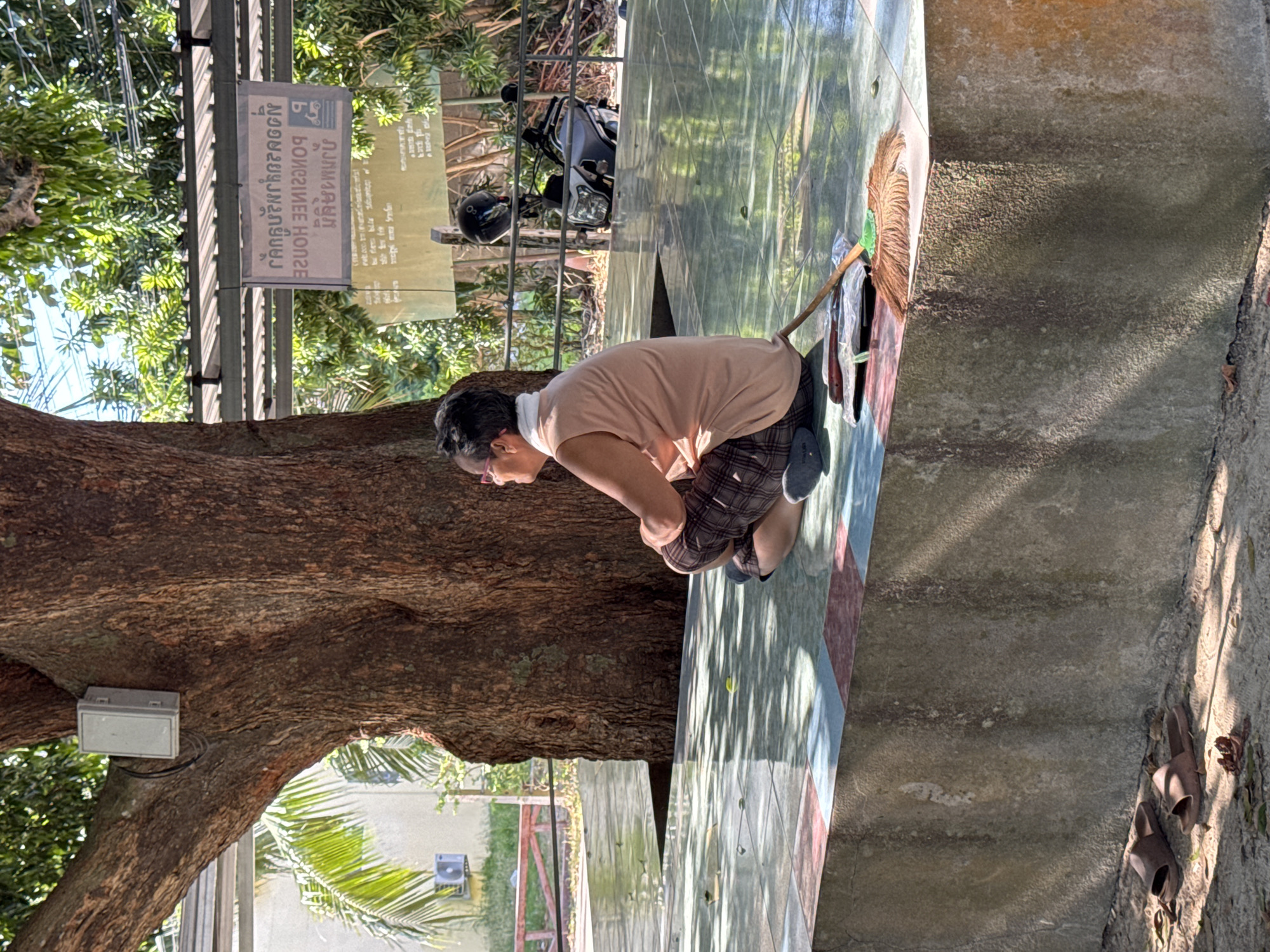 An adult individual is seated cross-legged on a tiled concrete platform under a large tree in Rawai, Thailand. The person has short, dark hair, wears pink-framed glasses, a light tan sleeveless top, and plaid capri pants. A white cloth is draped over their neck. They face right, looking upwards. On the platform next to them are a small natural-fiber broom with a red handle and a green tip, a plastic-wrapped item, and a dark object. A pair of brown slip-on sandals rests on the dirt ground at the base of the platform in the foreground. The tree, featuring a thick, textured brown trunk, has a grey electrical box mounted on it with black cables. The platform's top surface is tiled with light blue and green squares, while its concrete side shows patches of blue, red, and orange coloration with some staining. In the background, behind the platform, a grey scooter with a black helmet on its seat is parked behind a metal railing. Above the scooter, a rectangular sign displaying inverted Thai script, including "PORNGEE HOUSE" and a motorcycle icon, hangs under a corrugated roof structure. To the far left, a white building with an external air conditioning unit is visible through green foliage and a wooden fence. The scene is brightly lit by sunlight, casting distinct leaf shadows across the platform and ground.
