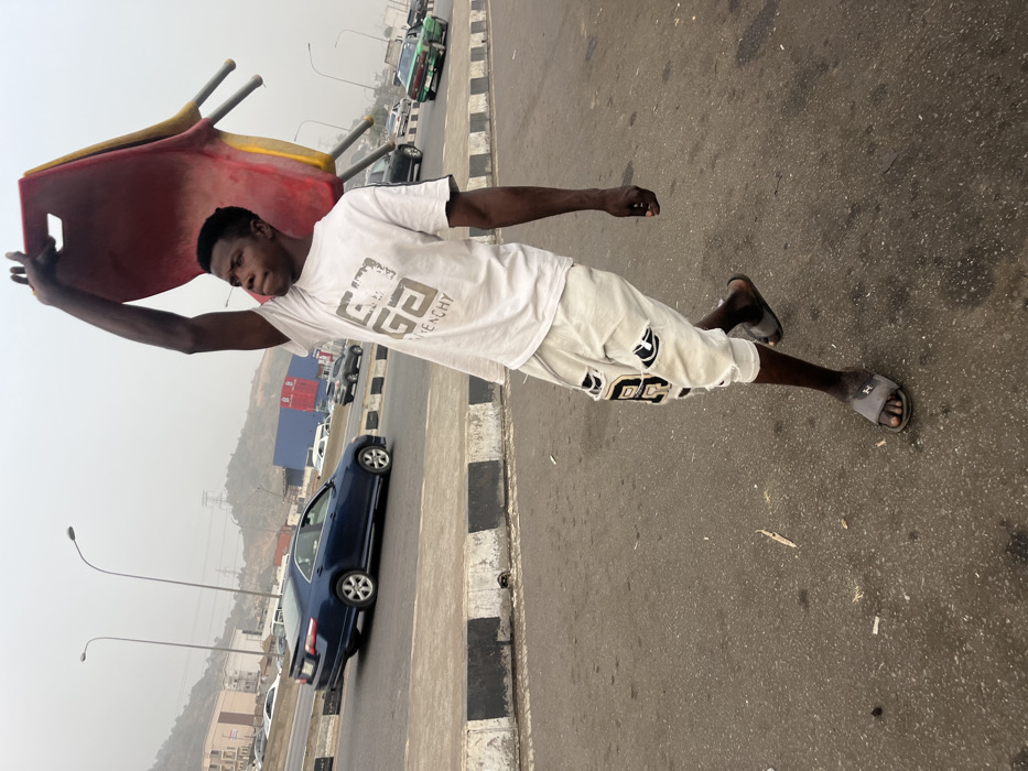 - "A young man stands on a highway with moderate traffic, holding a colorful chair above his head" by FM-marMB2, licensed under CC BY 4.0