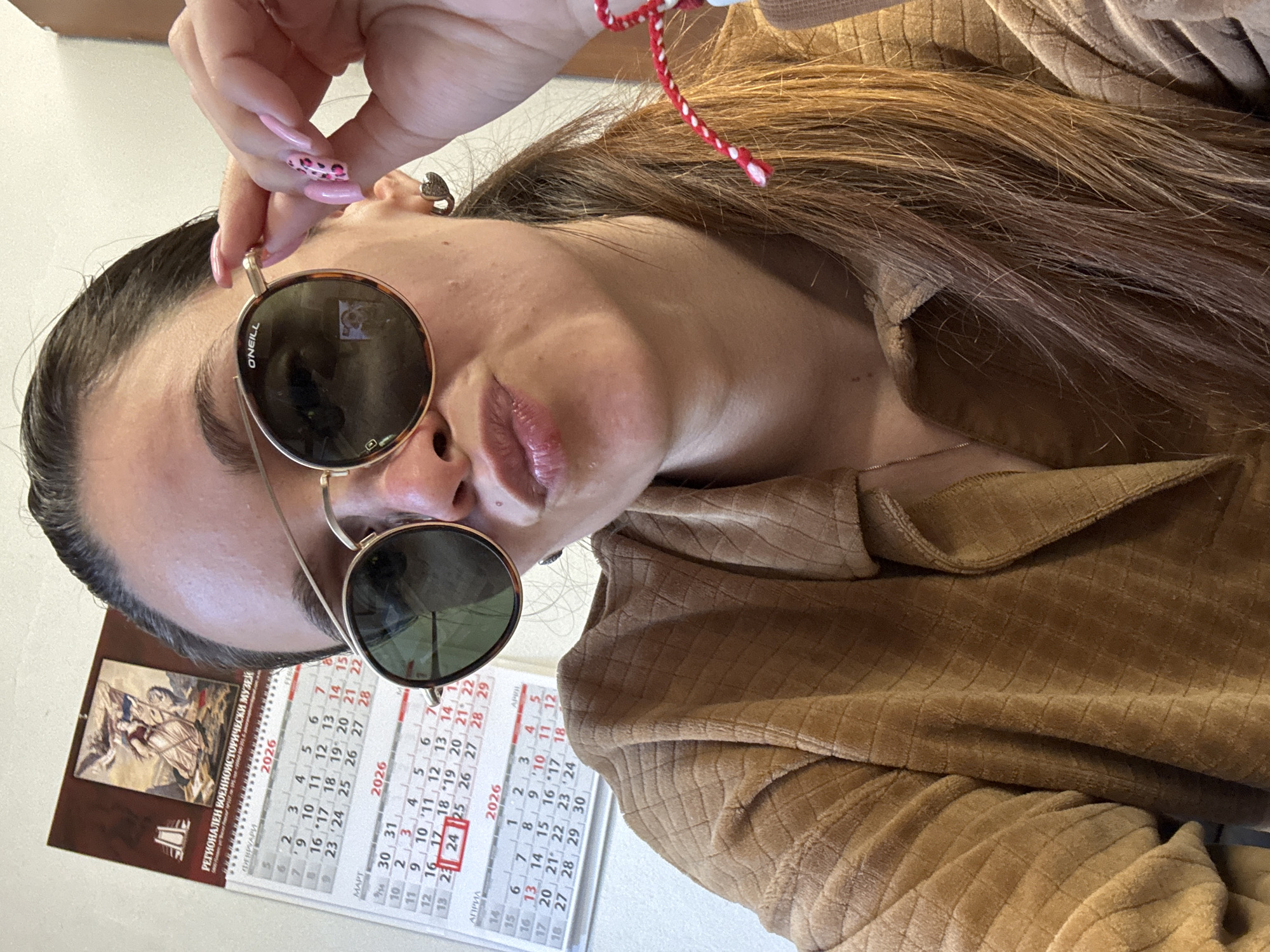 A woman is depicted in a selfie-style portrait, positioned indoors. She wears round sunglasses with dark lenses and gold-colored frames, marked "O'NEILL," which she adjusts with her right hand. Her lips are pursed, exhibiting a visible lesion on the lower lip. Her right ear has a small, silver-colored heart-shaped earring. Her right hand displays pink manicured nails, some with a black and pink leopard print pattern. She is dressed in a textured, light brown or tan long-sleeved top, possibly corduroy. A red and white twisted string Martenitsa bracelet is visible on her left wrist. Her brown hair is pulled back from her face. The background reveals a light-colored wall with a wall calendar for the year 2026 prominently displayed. The calendar's heading is "РЕГИОНАЛЕН ВОЕННОИСТОРИЧЕСКИ МУЗЕЙ" (Regional Military History Museum), indicating the location is associated with this museum in Pleven, Bulgaria. Above the calendar grid is an image resembling a tapestry, depicting a classical female figure holding a flag, positioned beside a lion. The calendar shows the months of February, March, and April 2026, with the date '24' in March highlighted by a red outline.