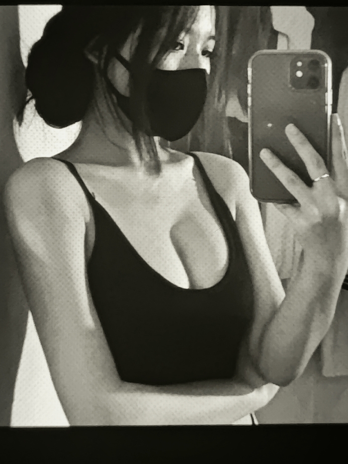 A person is photographed in a black and white, selfie-style image. They are wearing a black face mask and a dark, low-cut tank top. Their hair is styled in a bun with strands framing their face. They hold a smartphone, reflecting the scene, in their right hand, which has a ring on one finger. The background appears to be a wall with some indistinct patterns. The lighting is somewhat diffused, creating shadows and highlights across the scene.