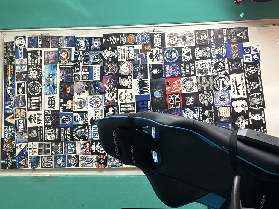 The image presents an indoor scene located in Dragijevo, Bulgaria. A black and blue DXracer gaming chair, seen from a partial rear-side perspective, occupies the left and lower-central foreground. The chair features a headrest with "DXRACER" branding, visible lumbar support, and prominent blue piping along its contours. In the background, a white-framed door is entirely covered by a dense, irregular arrangement of numerous rectangular and square stickers. These stickers are predominantly black, white, and blue, with occasional red, yellow, and green elements. Their designs feature text, graphics, and symbols primarily associated with the Bulgarian football club Levski Sofia and its fan culture. Specific details visible on the stickers include: - **Text and Slogans:** "Levski Sofia," "Levski," "ULTRAS," "HOOLIGANS," "OLD CAPITAL BOYS," "OLD SCHOOL," "SW99," "PROBLEMatic," "BOMB SQUAD," "Top Faces," "Fighter," "Blue Boys," "SOFIA," "WEST," "WEST 1999." English phrases include "ALL COPS ARE BASTARDS," "PYRO IS NOT A CRIME," "GOOD NIGHT WHITE PRIDE," "ALWAYS FOR THE PROBLEM," "VIOLENCE FOR FUN," "AGAINST MODERN FOOTBALL," "FCK LTX," "FCK CPS," and "FOR A LONG TIME AGO." Bulgarian text includes "ЛЕВСКИ или СМЪРТ" (Levski or Death), "СМЪРТ ЗА ПРЕДАТЕЛИТЕ" (Death to Traitors), "ТОП ФЕЙСОВЕ" (Top Faces), "БЪЛГАРИЯ" (Bulgaria), "75 години" (75 years), "СИНЬОТО ЗА МИНУТИТЕ" (Blue for the minutes), "СЕРТОР," "КУР ЗА," and "ДИВОТО КЪЛБО БЪЛГАРИЯ." - **Numbers and Dates:** "1914" (Levski Sofia's founding year), "1312" (ACAB), and "88." - **Imagery and Symbols:** Numerous stylized skulls (some wearing gas masks, helmets, or with crossbones), skeletons, fists, eagles, lions, various shields and crests, footballs, silhouettes of groups of people, the national flag of Bulgaria, and the letter 'A' enclosed within a circle. A solid teal-colored wall is visible along the far left edge of the image, providing a contrasting background to the door and chair. No individuals are present in the scene.