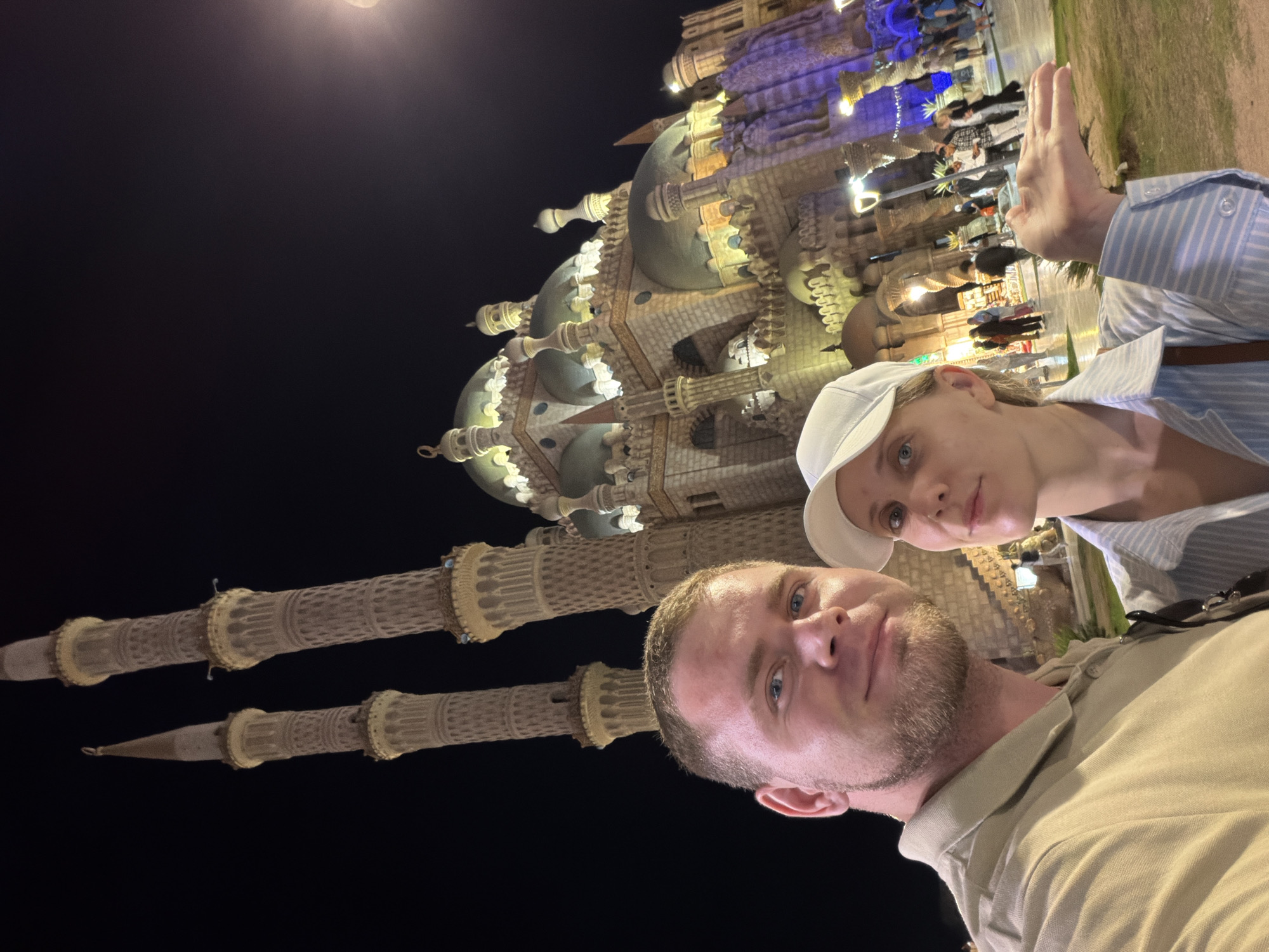 The image depicts two individuals posing for a photograph at night in front of the illuminated Al Sahaba Mosque, located in Sharm El Sheikh, Egypt. In the foreground, a male with short hair and a light beard, wearing a tan collared shirt, is positioned on the left, looking directly at the camera. To his right and slightly behind him is a female wearing a white baseball cap, a light blue and white striped long-sleeved shirt, also looking at the camera. Her left hand is extended forward with the palm open and facing upwards. The background is dominated by the Al Sahaba Mosque, a large, ornate structure with two prominent, intricately carved minarets visible on the left side, extending into the dark night sky. The main mosque building features multiple domes of varying sizes, the largest of which are a muted green color, and a facade constructed from light-colored stone with numerous arches and decorative elements. The mosque is brightly illuminated with artificial light, highlighting its architectural details and casting a warm glow, with some sections exhibiting purple and blue lighting. In the mid-ground, to the right of the mosque, a public area is visible with several blurred figures of other pedestrians and various light sources, indicating an active nighttime environment. A bright streetlamp is partially visible on the far right edge of the frame.