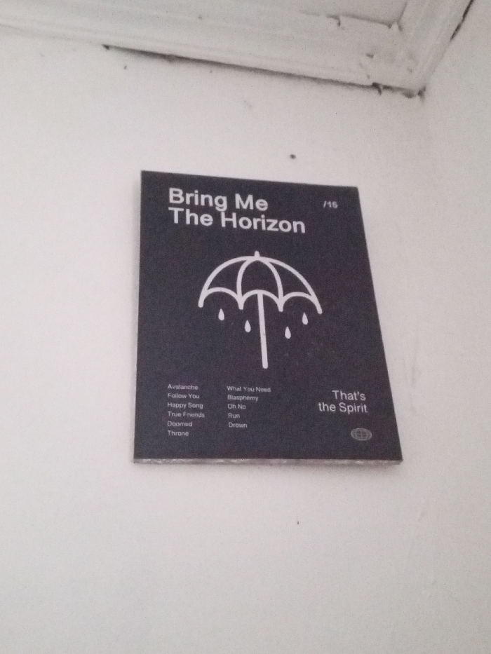 A dark grey, rectangular poster for the band "Bring Me The Horizon" and their album "That's the Spirit" is affixed to a white, textured wall