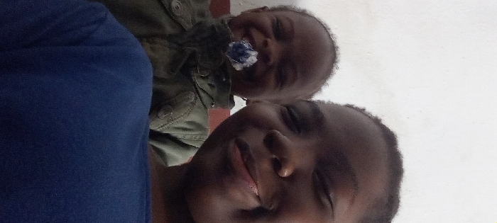 The image depicts two individuals in a close-up, indoor setting, against a plain, light-colored wall, in Ogbomosho, Nigeria. The individual in the foreground, positioned to the right of the frame, has dark skin and is visible from the lower forehead to the shoulder. This person is smiling with closed eyes and is wearing a solid blue garment across the lower portion of the image. Behind and to the left, a second, younger individual with dark skin is visible, smiling broadly with closed eyes. This individual is wearing a dark olive green jacket with a visible button on the upper chest. A blue and white object, resembling a wrapped sweet or lollipop, is held in the younger individual's mouth. A reddish-brown segment is partially visible in the lower-left background, possibly a wall dado or furniture. The lighting is uniform.