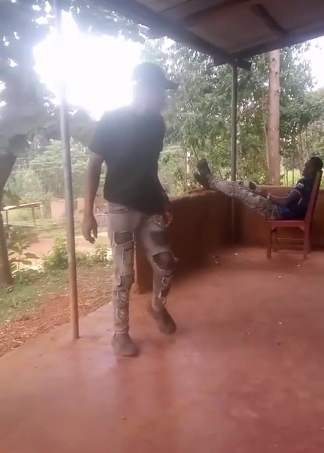 two individuals in what appears to be an outdoor covered patio or porch area. One individual, wearing a black t-shirt, ripped jeans, and a baseball cap, is standing and walking towards the camera. The second individual is seated in a chair, with their legs propped up on a low wall. The porch has a corrugated metal roof and red dirt floor. Outside the porch, there's visible greenery, trees, and possibly some other structures in the distance.