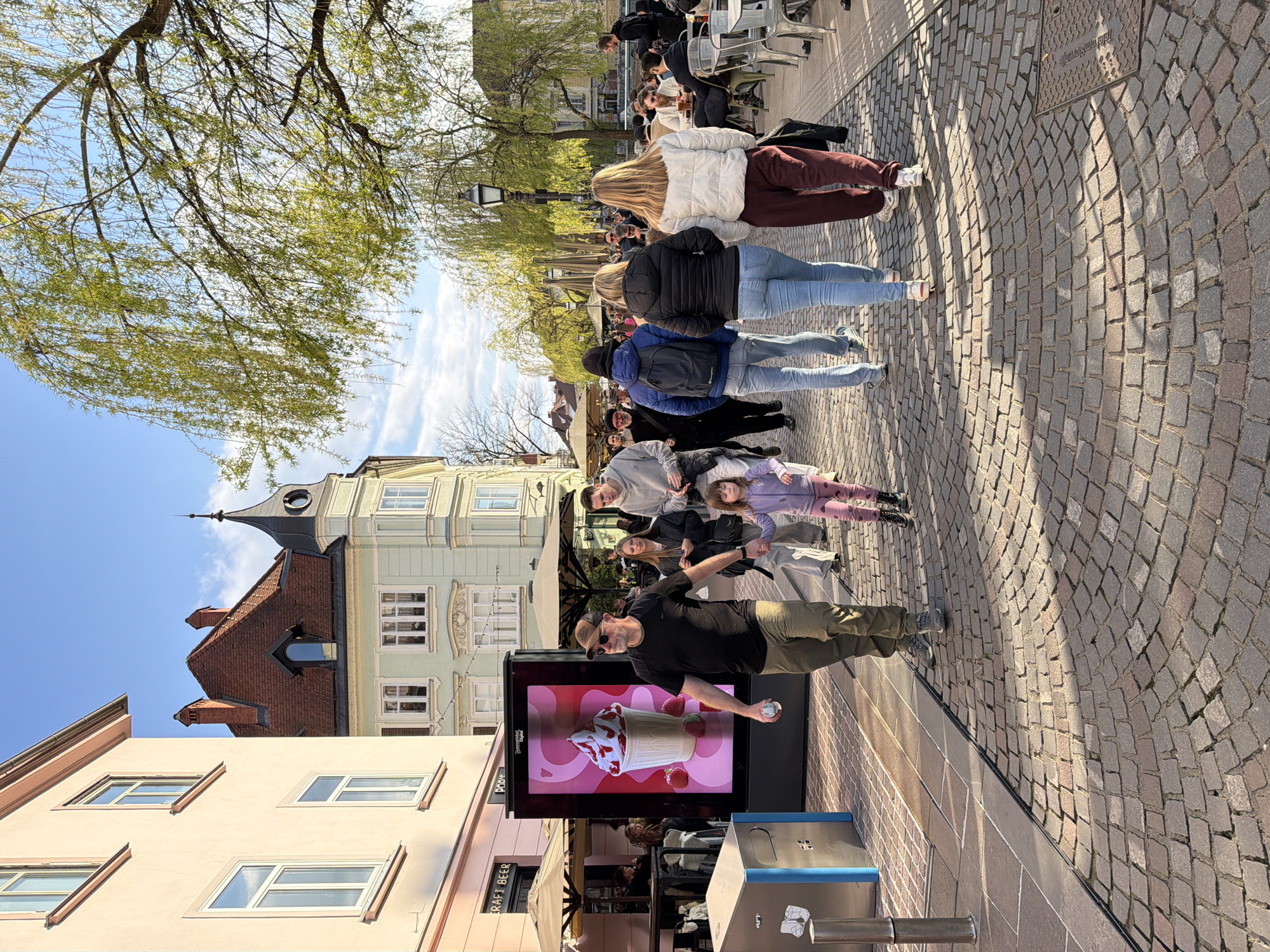 This image shows a street scene in Ljubljana, Slovenia. A row of people is walking along a cobblestone path, with a man closest to the foreground. He is wearing a black shirt, green pants, a hat, and sunglasses. To his left is a digital advertising screen displaying a picture of an ice cream dessert. A drinking fountain is next to the advertising screen. Behind the man are a group of people, including a child wearing purple clothing. The background features buildings with architectural details, including visible windows, rooftops, and a tower-like structure. A weeping willow tree is overhanging the street. The sky is blue with scattered clouds. Further down the street, people are sitting at outdoor tables.