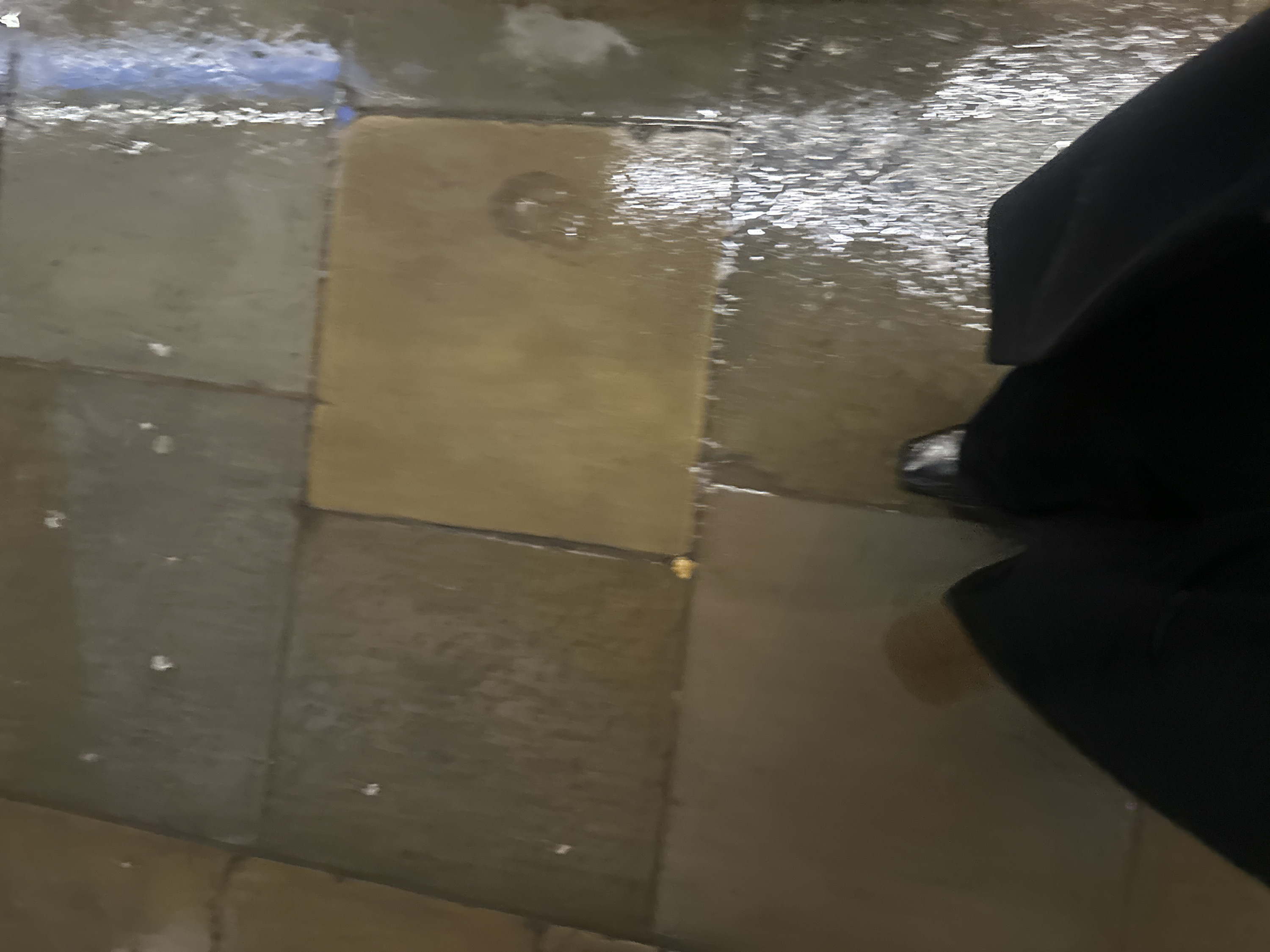 A close-up shot shows paving stones, some wet, reflecting light, while others appear dry and brown. A dark, unidentifiable form, possibly clothing, occupies the right side of the frame, partially obscuring the paving stones. A single shoe is visible near the dark form, resting on a wet surface. The scene appears to be outdoors, possibly after a rain shower.