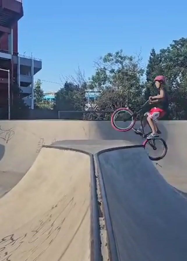 - "A young person wearing a red helmet and shorts is riding a red BMX bike in a skatepark" by FM-HObRY2, licensed under CC BY 4.0