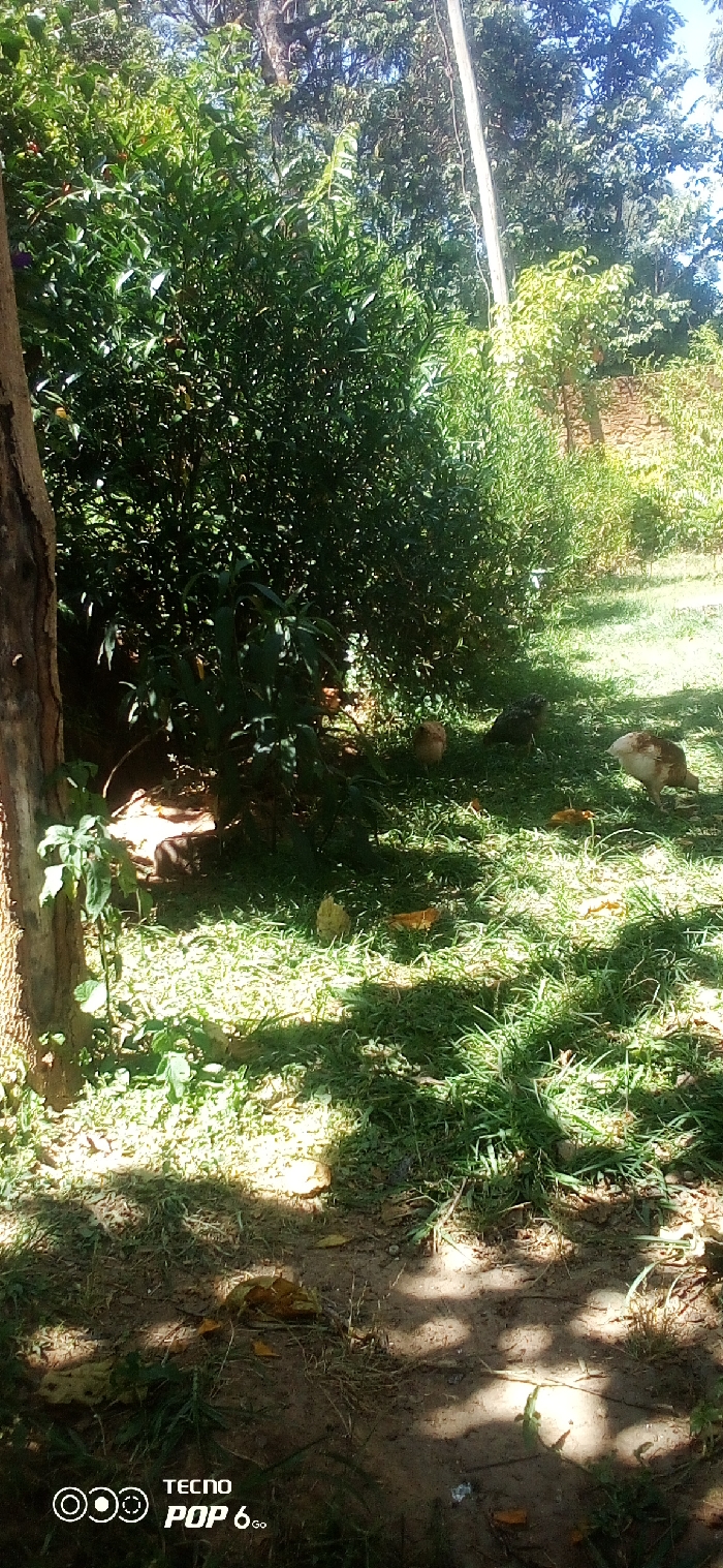 The image depicts an outdoor scene in the city of Unknown, Unknown, under clear, sunny conditions, indicated by strong illumination and distinct shadows. The foreground features a dirt path interspersed with patchy green grass and scattered dry leaves. A thick, dark brown tree trunk is prominent on the far left. In the midground, a grassy area hosts four chickens actively foraging. From left to right: one light brown chicken is partially obscured by dense green foliage; a dark-feathered chicken stands centrally; another brown-and-dark-feathered chicken is slightly behind the previous one; and a light-colored chicken with white and brown feathers pecks at the ground on the right. A large, dense green bush or shrub dominates the left and central midground. The background consists of additional dense green trees and foliage. A light-colored vertical pole is visible extending upwards on the right side. A stone wall, possibly a retaining wall or boundary, is partially visible behind vegetation on the far right. The top edge of the frame reveals patches of bright blue sky. No human subjects are present. The environment suggests a rural or semi-rural setting.