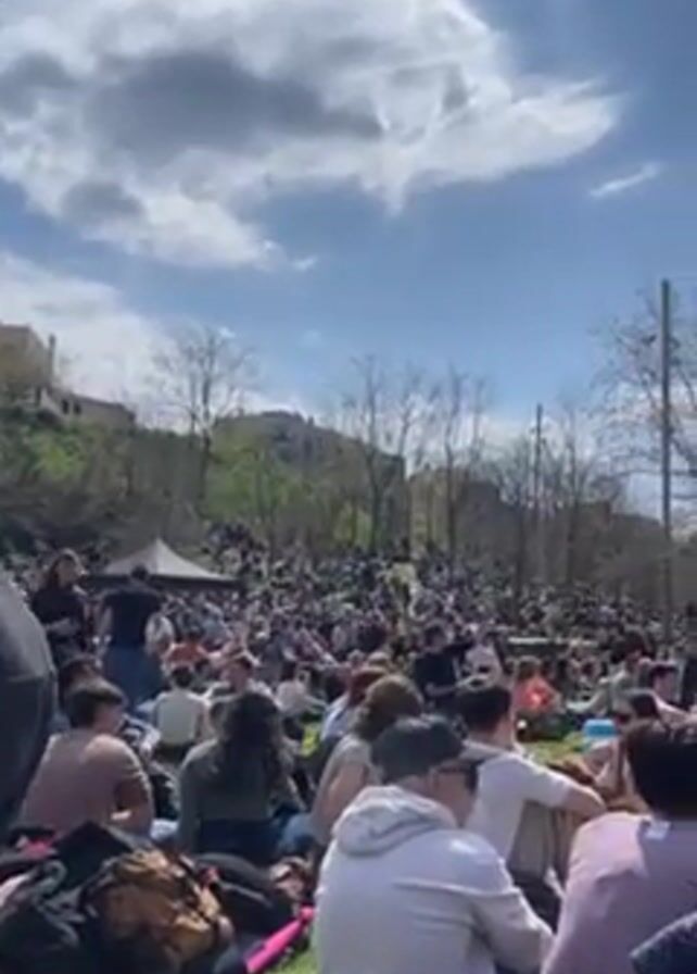 The video captures a wide shot of a large crowd gathered in an outdoor setting, possibly a park or grassy field, on a sunny day with a blue sky and scattered clouds. People are sitting, standing, and moving around, indicating an event or gathering. In the background, trees and some building structures are visible. The crowd is dense, with individuals of varying ages and clothing styles. In the distance, a small stage or tent-like structure is present. The camera pans across the scene, showing the expanse of the crowd and the surrounding environment. Overall, the video depicts a vibrant outdoor gathering.