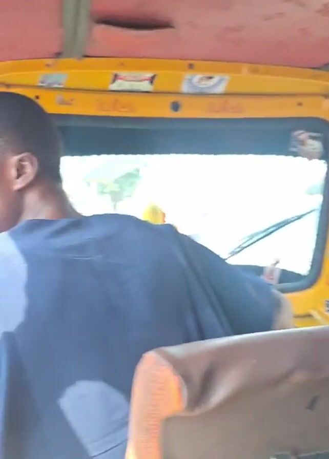 person wearing a blue jacket riding in a yellow auto rickshaw. A second person is behind the first, and the auto rickshaw is moving on a street with parked cars and buildings on the side. The buildings appear to be shops.