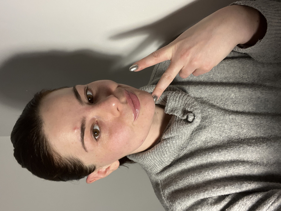 A woman poses close-up, tilting her head toward the camera while making a peace sign with her fingers. Her skin is fair, and her hair is dark. She wears a grey turtleneck sweater with a button near her shoulder. Her lips are shiny with gloss, and her fingernails are painted with a metallic silver color. The background is a plain, light-colored wall with a shadow cast by the woman's hand. The lighting highlights her features and creates subtle shadows on the wall.