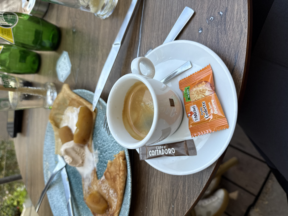 This image captures a close-up view of a dining table at an outdoor café in Antibes, France. In the foreground, a white ceramic cup containing dark coffee rests on a matching saucer with a silver spoon. Alongside the cup are a brown sachet labeled "CAFFE COSTADORO" and an orange packet of "St Michel Petite Galette au bon Beurre" cookies. To the left, a light blue speckled plate holds a partially eaten crêpe, topped with several pieces of stewed fruit and a scoop of melting light brown ice cream. A silver fork and knife are positioned on the plate and table. The dark wooden table surface also features two empty green glass Perrier bottles, a clear glass of water with a bamboo straw, another empty clear glass, and a dark-colored smartphone. Water droplets are visible on the table surface. A person's leg, clad in dark trousers, is partially visible in the lower right, beneath the table. The background shows blurred green foliage, consistent with an outdoor seating area.