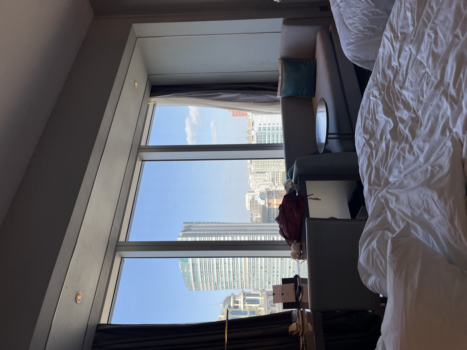 A view from a high-rise window reveals an urban cityscape under a clear, blue sky