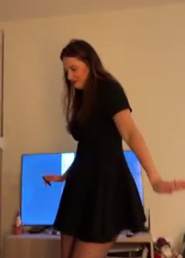 A woman with long brown hair is dancing and singing in a room. She is wearing a short-sleeved black dress and patterned tights. Behind her is a television and a wooden TV stand with a bottle of alcohol and a Santa Claus figurine on it. The woman is holding a pen in one hand as she moves around. The walls of the room are a light beige color.