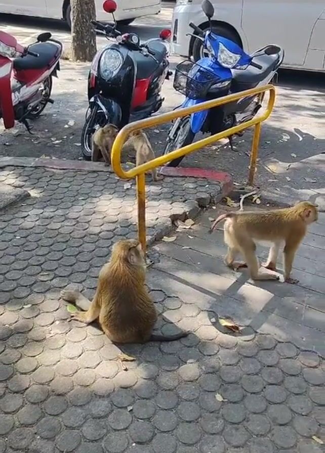 four monkeys in a parking lot. One monkey is sitting on a gray patterned pavement, its back to the camera. Another monkey is walking to the right, while two smaller monkeys are near a yellow metal barrier behind the seated monkey. Motorbikes and white vans are parked in the background. The scene is lit by sunlight, casting shadows from the monkeys and other objects.