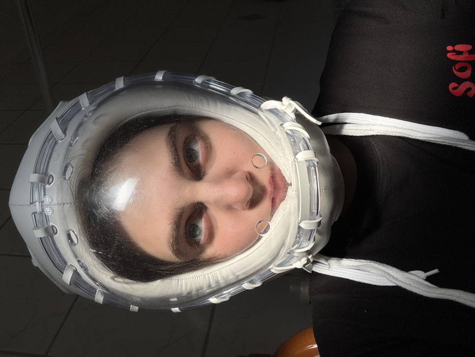 The scene depicts an adult female subject, located in Hainburg an der Donau, Austria, captured in a close-up portrait from the chest up. She is wearing a distinctive white and light grey helmet that fully encloses her head and face. The helmet features a clear, transparent visor component across the facial area, revealing the subject's face, including dark hair, blue/grey eyes directed upwards, and fair skin. Two small, circular, transparent openings are present in the visor near the subject's mouth. The helmet's interior appears to be lined with white, padded, leather-like material. Its exterior is constructed with light grey, possibly textured panels, exhibiting visible seams and stitching, along with clear tubular structures running vertically along the sides, secured by white loops or straps. White cords, resembling laces or part of a securing mechanism, extend downwards from the helmet's base and rest on the subject's chest. She is dressed in a black t-shirt with a red inscription, "Sofi," visible on the lower right. The background is dark and indistinct, suggesting an indoor setting with limited illumination. A partially obscured, out-of-focus brown object is visible on the far left side of the frame. The lighting appears to originate from an upper-left source, casting highlights on the helmet and the subject's face.