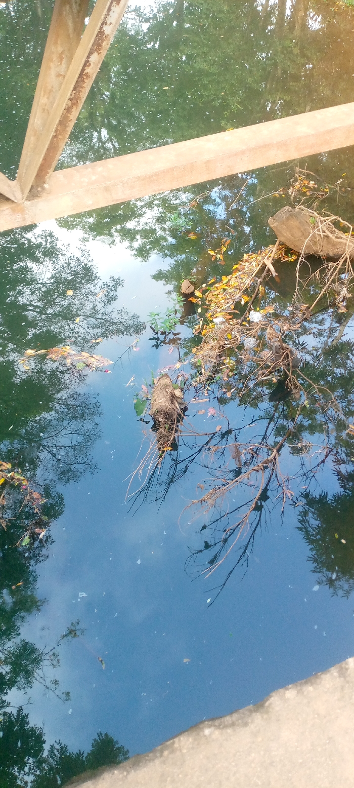 A still body of water reflects surrounding trees and sky, creating a mirrored effect. Debris such as branches, leaves, and small logs float on the surface. A weathered metal structure frames the top left corner of the image. The water appears dark green and blue, suggesting depth. The angle is from above, capturing a close-up view of the water's surface and the reflections within. A concrete edge is visible in the lower right corner.