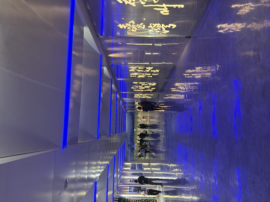 A brightly lit indoor corridor stretches into the distance. People stand and walk along the side. Blue light lines the walls and ceiling, illuminating the floor. The ceiling features reflective panels with Arabic-like script. The floor reflects the blue light and the script above. The hallway appears clean and modern.
